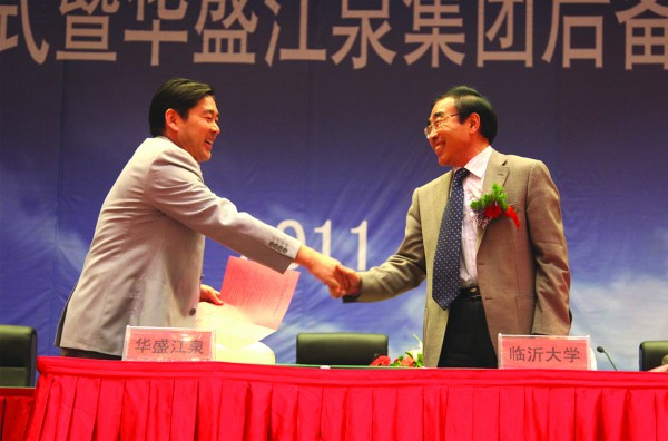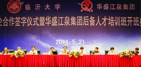 2011年5月21日,臨沂大學華盛江泉集團校企合作簽字暨華盛江泉集團后備人才培訓班開班盛典在江泉城舉行。出席典禮儀式并在主席臺就坐的領導有:臨沂大學校長韓延明博士,臨沂大學商學院院長、教授、許汝貞博士,臨沂大學繼續教育處處長李殿勇教授,臨沂大學商學院培訓中心主任、王郡華教授,臨沂大學商學院刁玉柱博士,羅莊區人民政府吳漢林副區長,沈泉莊黨委于孝燕書記,沈泉莊黨委副書記、華盛江泉集團高洪路總經理,沈泉莊黨委副書記、華盛江泉集團王廷寶副總經理,以及臨沂電視臺、臨沂人民廣播電臺、臨沂日報社等新聞媒體的記者和集團所有高管、各單位管理人員及后備人才等,共800余人出席會議。